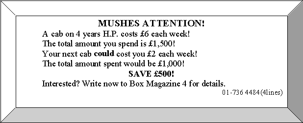 happenings could make James Bond read like an Enid Blyton. A Star in the making We all get days when nothing seems to go right, legals, scrubs, etc. This was just the sort of day. Even the radio was playing me up. I could hardly hear the B.B.C. credit job "No Charlie 84 SHIP in a bottle to go to …" That could have been embarrassing. I recall approaching a junction trying to decide whether to turn left or right. All the time decisions; I turned left. The cab behind me turned right and got a "four hander" I got a dented wing. Did I say dented? It looked as though it was hanging on with chewing gum. A solid looking Land-Rover was determined to prove that they have right of the way and I was fuming. I shot out of the cab ready for a punch up. "Sorry darling," she said, and out of the Land Rover slipped … yes, it was er… what’s her name? Fiona Donaldson, the international actress. Of course this altered my whole altitude. Who would think of punching up Fiona? I just melted on the spot. "Don’t worry about your silly little knock," she said, "you’re just the man I’m looking for and I’m glad I bumped into you. Now you know what you gotta do!" I just couldn’t stand any more. " What do you want me to do," I angrily replied. "Well you have to" I will not go into details as the whole process took hours to film. Briefly I was to drive down a street on the set, with Fiona in the back. A car then appears from a side street and thumps my wing, which had already been prepared by Fiona. Only the sound effects were needed, I then get out and start shouting, only to be knocked out. Fiona is schlepped out of the cab and driven of at high speed in a Land Rover. You can imagine how I felt. I was a star! I was acting with real, live, actors. After a hectic day at the studios I was thanked and paid for my supreme acting ability. I drove home feeling on top of the world. When I pulled into the garage everyone looked at my distorted wing. It was only then I realised I had not taken any particulars of the accident. Well what’s a little tap on the cab to a star. We stars must keep together. The show must go on and all that jazz. I told everyone of my experience. Family, friends, and my latest date. She always played hard go get, so telling her would make me big in here eyes. I promised I would take her to the Command Performance. The Press had gone overboard with the film. Every critic gave it the thumbs up. One paper even had a bit I didn’t let her finish. Out of my cab came an old man with a stained A.R.P. coat and a walrus moustache. I need you in a film I’m making. No, I really mean it. Now close your mouth and listen." I did this, and as I was dumbfounded I listened. " I need a young, handsome cabby to play an important part, and you are my man." Before I could catch my breath I was following her to Timewood Studios. When we arrived, we drove straight on to what appeared to be the set. Filming was at full blast. Cameras and lights everywhere, Fiona alighted and walked over to an amazed Producer. After about three minutes, the producer started to rave, flung his arms around Fiona shouting "Fantastic, just what we needed!" The Producer then dashed over to me talking at a terrific rate. "You’re the guy. About " The authentic taxi scene!" This made my head even larger. I felt I couldn’t leave the mirror to go to work in the mornings. I got tickets for the big night, and with Press cuttings in one hand and chocolates in the other I called for my |